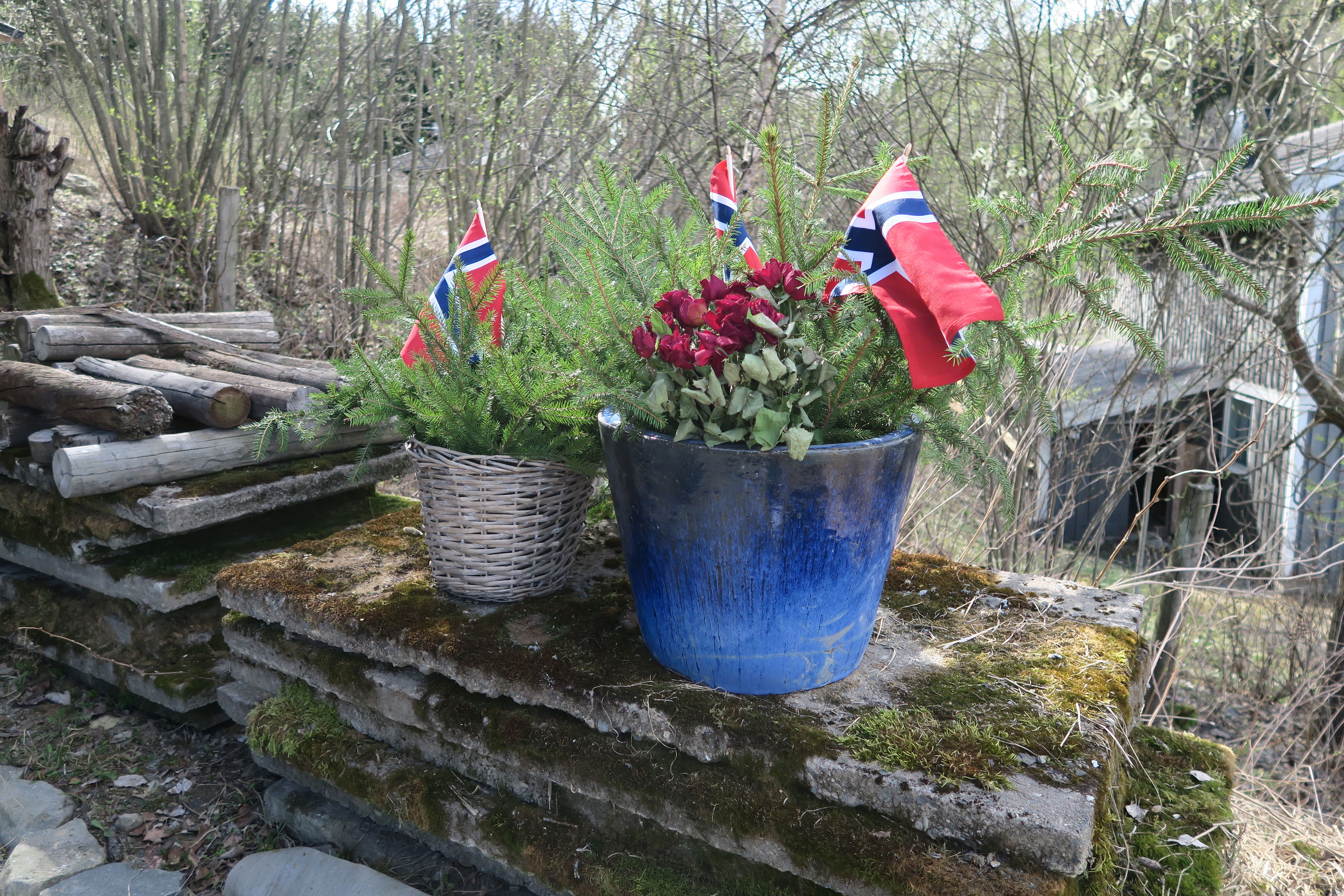 For å få det fint ute til 17. mai, så er det ikke så mye som skal til. Har du blomster, bjørkeløv eller granbar og flagg i balkongkasser eller potter på terrassen, er det kanskje allerede fint nok.