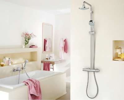 Dusjsystem fra Grohe: New Tempesta Cosmopolitan med termostat. Grohterm Cosmopolitan termostatbatteri til kar og dusj. Med Rainshower Icon håndusj. Foto: Varme & Bad.