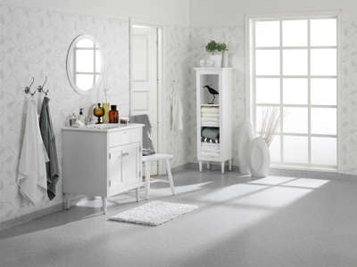 «Aquarelle» fra Tarkett er en våtromskolleksjon inspirert av nordisk natur. Her er «White meets white». Foto: Tarkett