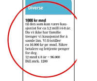 «1000 kr mnd. til den som kan være kausjonist for ca. 3,2 millioner i 6 – 8 år. Da vi ikke har familie trenger vi kausjonist for å samle lån. Vi fristiller ca. 16.000 kr pr. mnd. Sikre betalere og lettjente penger for deg. 12 mnd. x 8 år = 96.000. Bill.mrk. 1200».