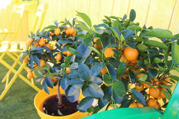APPELSINTRÆR: Det er ikke bare ny maling på møblene som frisker opp uterommet, det kan også disse dekorative appelsintrærne gjøre. Siden de er kunstige så er de også enkle å vedlikeholde. Foto: Linda Ørstavik Öberg.