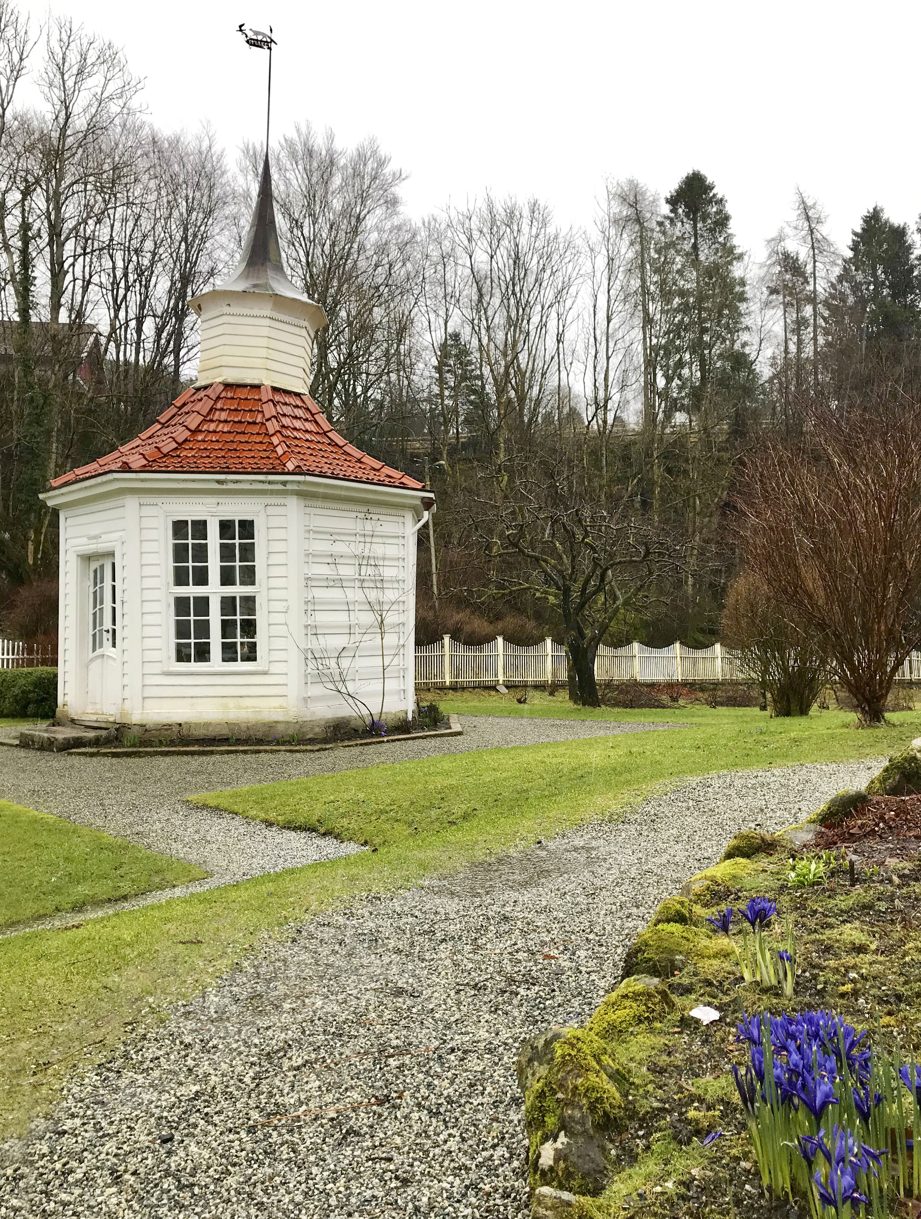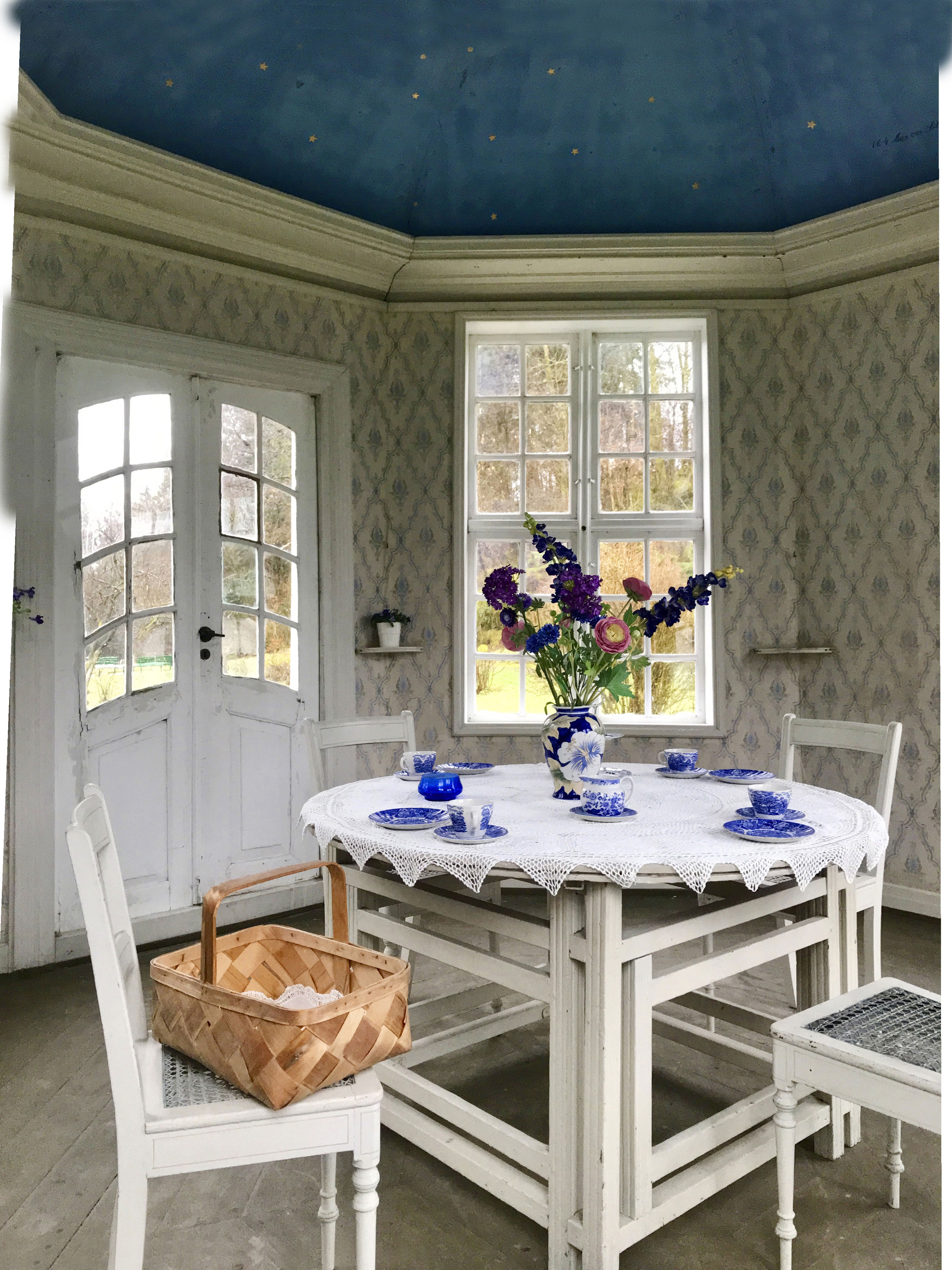 Hennes egen favoritt er hagepaviljongen på Rød herregård ved Halden – en bygning fra 1756. Her er det marmordekorerte gule vegger og hvitmalte brystpaneler med store speil innvendig. En flott kamin ga ekstra varme tidlig på våren eller sent på kvelden.