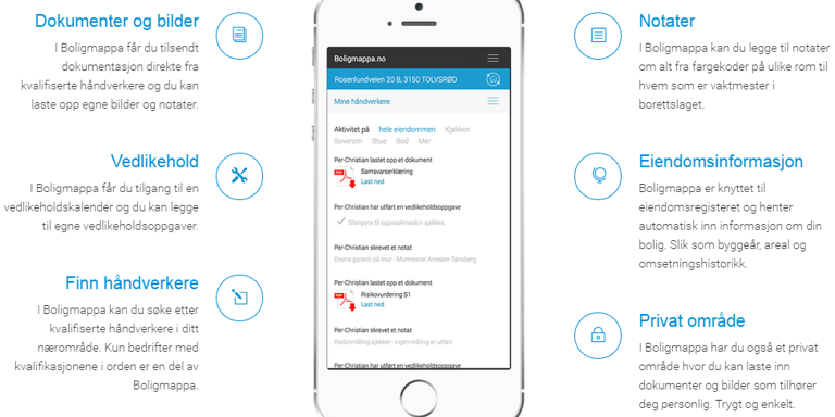 Boligmappa er serviceheftet til alle bygg og boliger i Norge. Håndverkere kan sende inn dokumentasjon direkte, som samsvarserklæringer, bilder og garantibevis. Boligeieren kan også laste opp det de selv vil, som kvitteringer og fargekoder. I tillegg finner man nyttig informasjon fra Eiendomsregisteret, som omsetningshistorikk, tidligere eiere og servitutter.