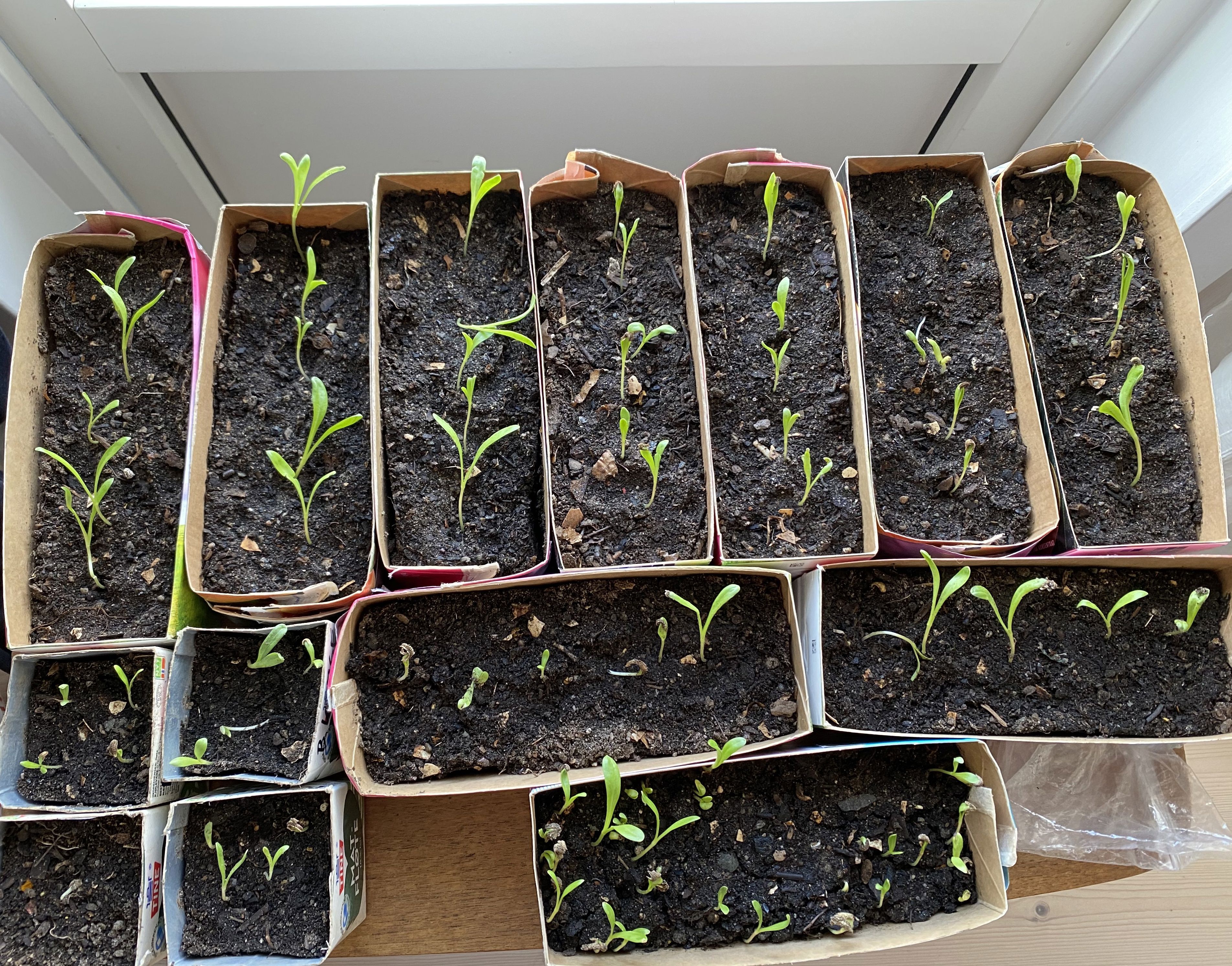 Kartongene bruker du til å så, og de gjenbrukes når du har priklet spirene. Å prikle vil si å plukke fra hverandre de tettsådde spirene til egne potter eller fordelt over flere potter for å gi dem plass til å vokse.