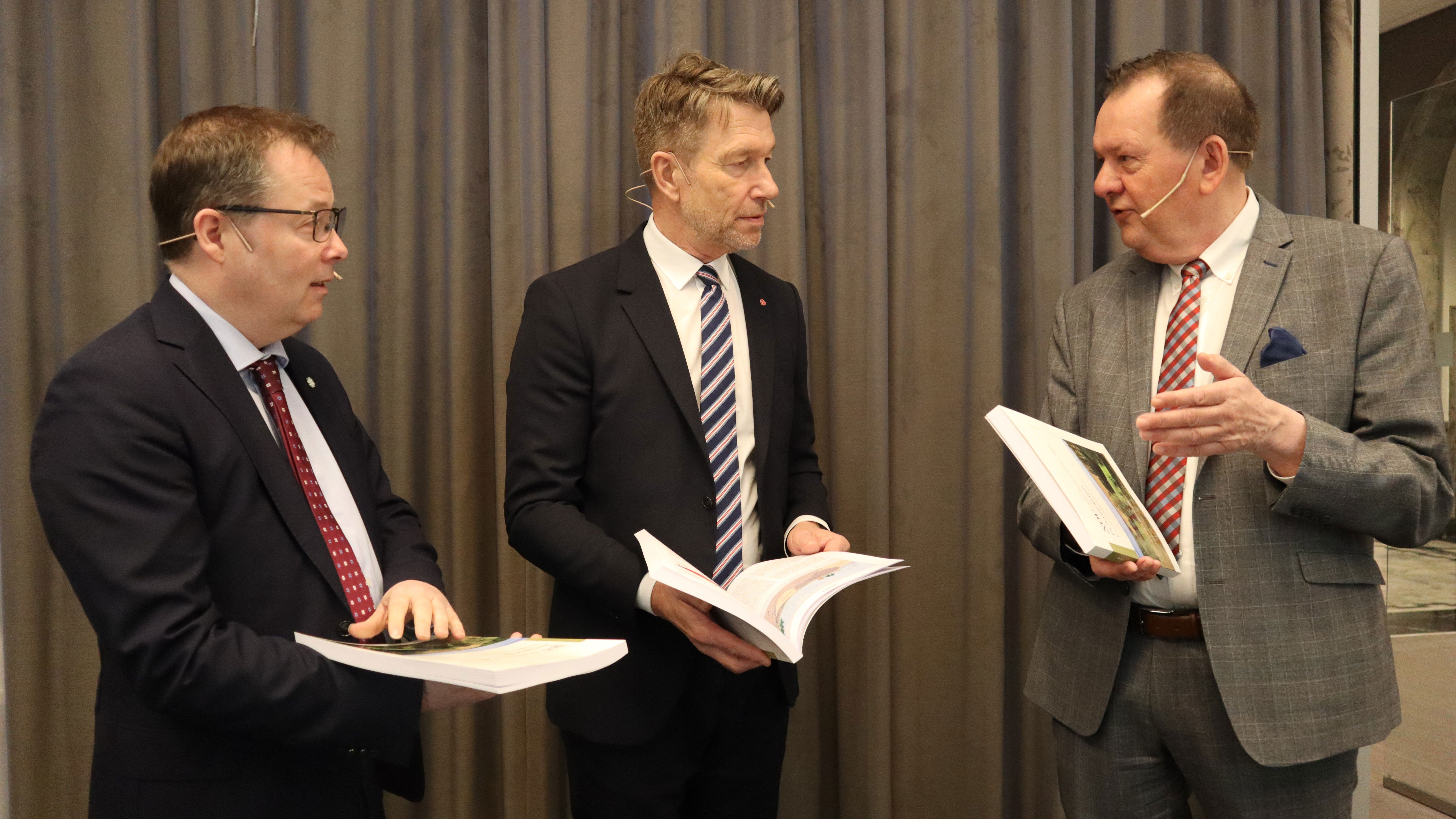 Gjerdrumutvalgets leder, Inge Ryan (f.h), overleverte rapporten til olje- og energiminister Terje Aasland og kommunal- og distriktsminister Bjørn Arild Gram den 28. mars 2022. Foto: Ella Ege Bye/OED