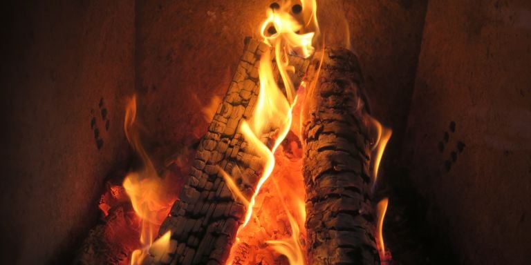 Når vedkubbene begynner å bli varme, avgir de organiske gasser. Halvparten av energien ligger i disse gassene.